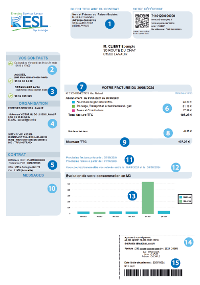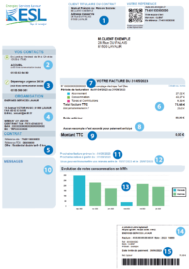 Je retrouve l’ensemble des éléments pour m’aider à bien comprendre ma facture de gaz naturel et/ou d’électricité Énergies Services Lavaur.