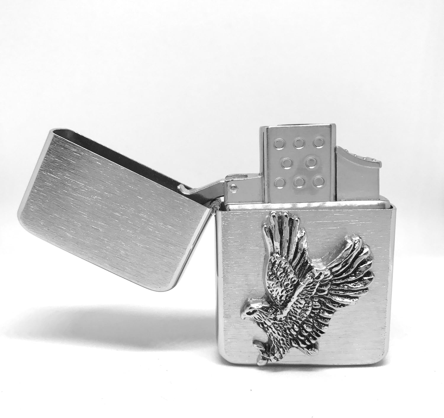 The Cigar Cutters by Jim stainless steel pocket lighter with single-flame torch includes one of our custom logo designs on a Thunderbird Vector pocket lighter with its "no proof" warranty included. This cigar lighter is a traditional rectangle metal shape with a butane insert that provides an odorless and tasteless flame to light your favorite cigar or light your cigarette. Lighter provides a consistent, wind resistant flame to light your cigar/cigarette in all sorts of weather and is designed with your selected logo design for good looks plus it is lightweight for your pocket.