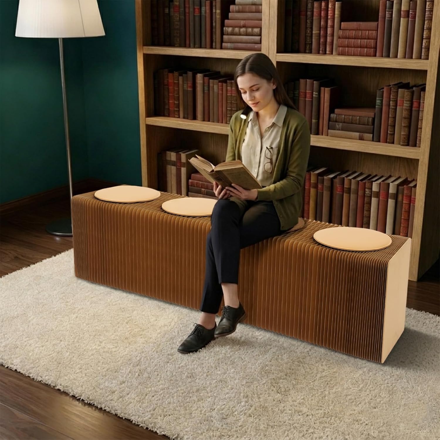 ApplicationIt can be used as a stool, bench, sofa, coffee table, shoe-changing stool, make-up stool, or side table, etc. It is suitable for homes, hotels, restaurants, bars, clubs, waiting rooms, camping,etc.SpecificationsColor: BrownStyle: ModernMaterial: High-fiber Kraft Paper, Artificial Leather, Sponge, Artificial BoardProcess: Adhesive Bonding, StitchingMount Type: Floor StandingEach Cushion Load Capacity: 100kg/220.46lbsProduct Folded Size (W*H): 36*40cm/14.17*15.75inProduct Fully Expanded Length: 120cm/3.93ftPackage Size: 42*38*9cm/16.54*14.96*3.54inGross Weight: 3.2kg/7.05lbsNet Weight: 2.88kg/6.35lbsPackage Included 1* Folding Craft Bench2* CushionsNotes1. Please check the product size carefully before purchasing. 2. Please note that the product does not include other items.3. Please use the product within its load-bearing capacity.4. For first-time use, two people are recommended to fully expand the product to achieve better load-bearing performance.5. Do not sit directly on the bench; please use it with a cushion.6. For the reliability of the material, the adhesive is made of corn starch. Therefore, do not soak the bench in water.