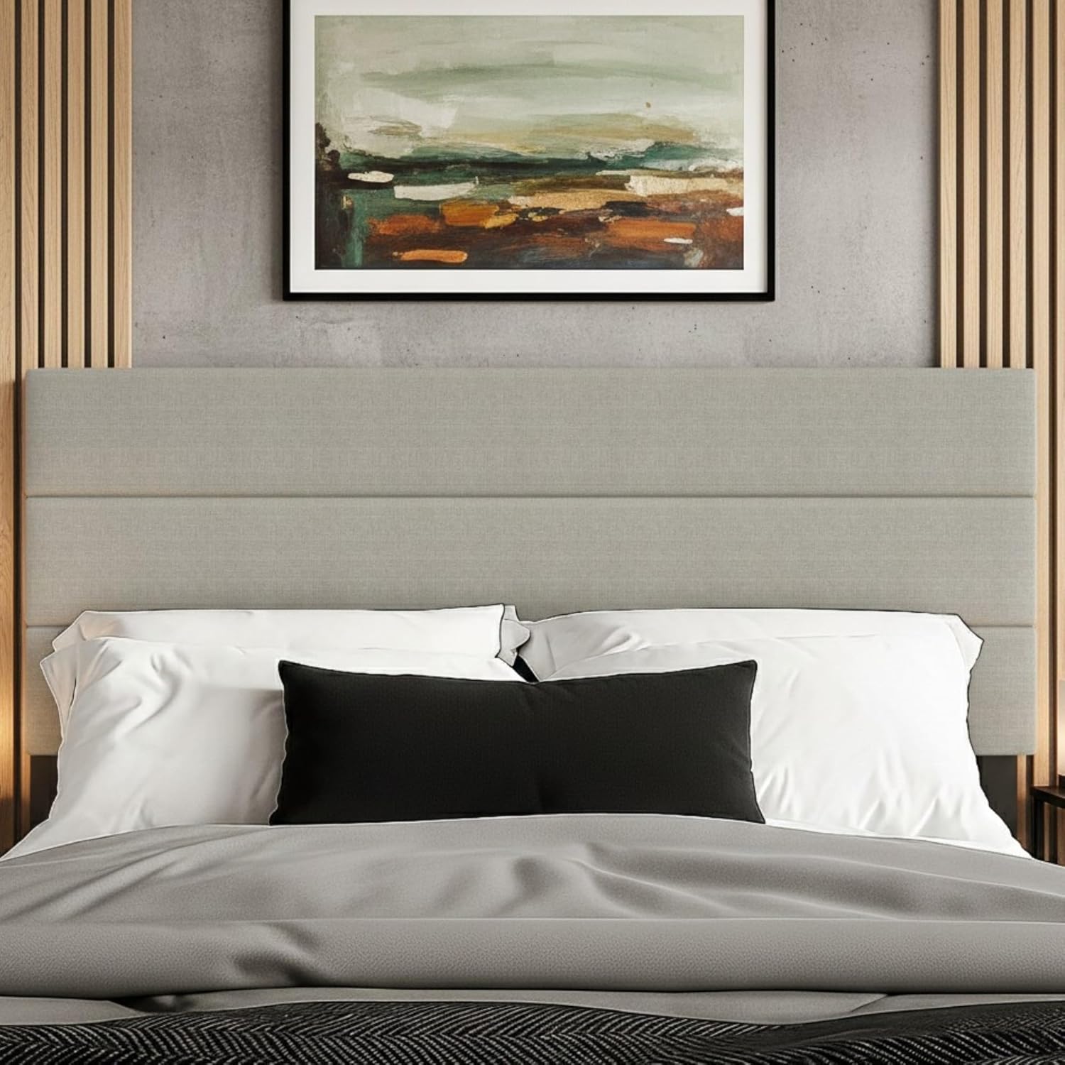 HOME DESIGN Etta Upholstered Panel Headboard brings a sleek and minimalist look to your bedroom with clean lines and subtle texture. Designed with horizontal channel tufting, this headboard adds a refined mid century modern touch that complements a variety of decor styles. Upholstered in durable polyester fabric and padded with foam, it provides comfortable support for reading or relaxing in bed. The panel design offers a streamlined appearance while maintaining everyday comfort and functionality. Compatible with standard bed frames featuring pre drilled holes, the Etta Headboard is easy to attach and install. Available in Gray and Warm Gray and offered in Twin, Full, Queen, and King sizes, this headboard delivers modern style and comfort for any bedroom.