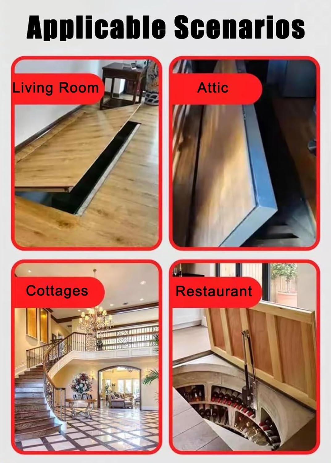 Since your access door must withstand years of heavy loads and daily wear and tear, why compromise on durability?Never compromise. Crafted from heavy-duty steel, this access door supports up to 500 kg/1100 lbs, delivering lasting strength to effortlessly handle foot traffic, storage items, and every challenge that comes your way.Why struggle with complicated installation?Professional installation isn't just time-consuming and labor-intensive—it adds extra costs. Our access door comes with a complete hardware kit for quick basement door installation.Our recessed design includes all necessary accessories. Simply cut a 2x4-inch recessed step in your wall for easy installation—no professionals needed, no complicated steps to worry about.Specifications- Material: Steel- Size: Customizable- Thickness: 1.5mm- Frame Tubing: 4x8cm (1.5x3in)- Max Load Capacity: 500kg / 1100lbsProduct Highlights- Effortless Operation: Features large suction cups and ergonomic handles for swift, frictionless opening/closing- Custom Fit: Precisely tailored to your opening dimensions—simply provide length and width for a perfect match- Versatile Compatibility: Suits diverse flooring materials, blending seamlessly with modern or traditional home aesthetics- Low Maintenance: Resistant to wear and daily stress, ensuring long-lasting reliability with minimal upkeepPackage Contents1 x Concealed Wine Cellar DoorImportant NotesManual measurements may vary by 1-3 cm; your understanding is appreciatedActual product color may differ slightly due to lighting conditions and individual color perception