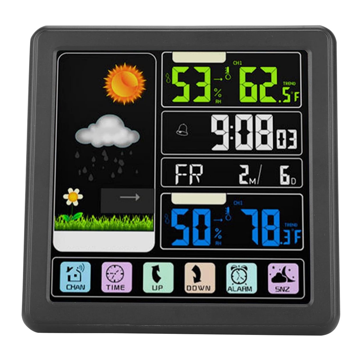 1. Admits viewing in seven languages: English, Italian, Danish, French, German, Spanish and Dutch. 2. USB interface plug design, food port. 3. Designed with kids screen lock. 4. Full color LCD with weather icons: sunny, partially sunny, cloudy, rain. 5. Excellent quality and durability. Specification: Features: 1. Admits viewing in seven languages: English, Italian, Danish, French, German, Spanish and Dutch. 2. USB interface plug design, food port. 3. Designed with kids screen lock. 4. Full color LCD with weather icons: sunny, partially sunny, cloudy, rain. 5. Excellent quality and durability. Specifications: Material: ABS Weight: 384 g Size: approx. 13.5 x 13.5 x 3 cm/5.31 x 5.31 x 1.18 inches. External unit size: approx. 3.2 x 2 x 9.2 cm/1.34 x 0.79 x 3.62 inches. Indoor temperature detection range: 0-+50°C External temperature detection range: -20-70°C Humidity range: 20%-95% Battery: 2 x AAA (not included). Package contents: 1 x host. 1 x external machine. 1 x data line. 1 x connection. 1 x user manual